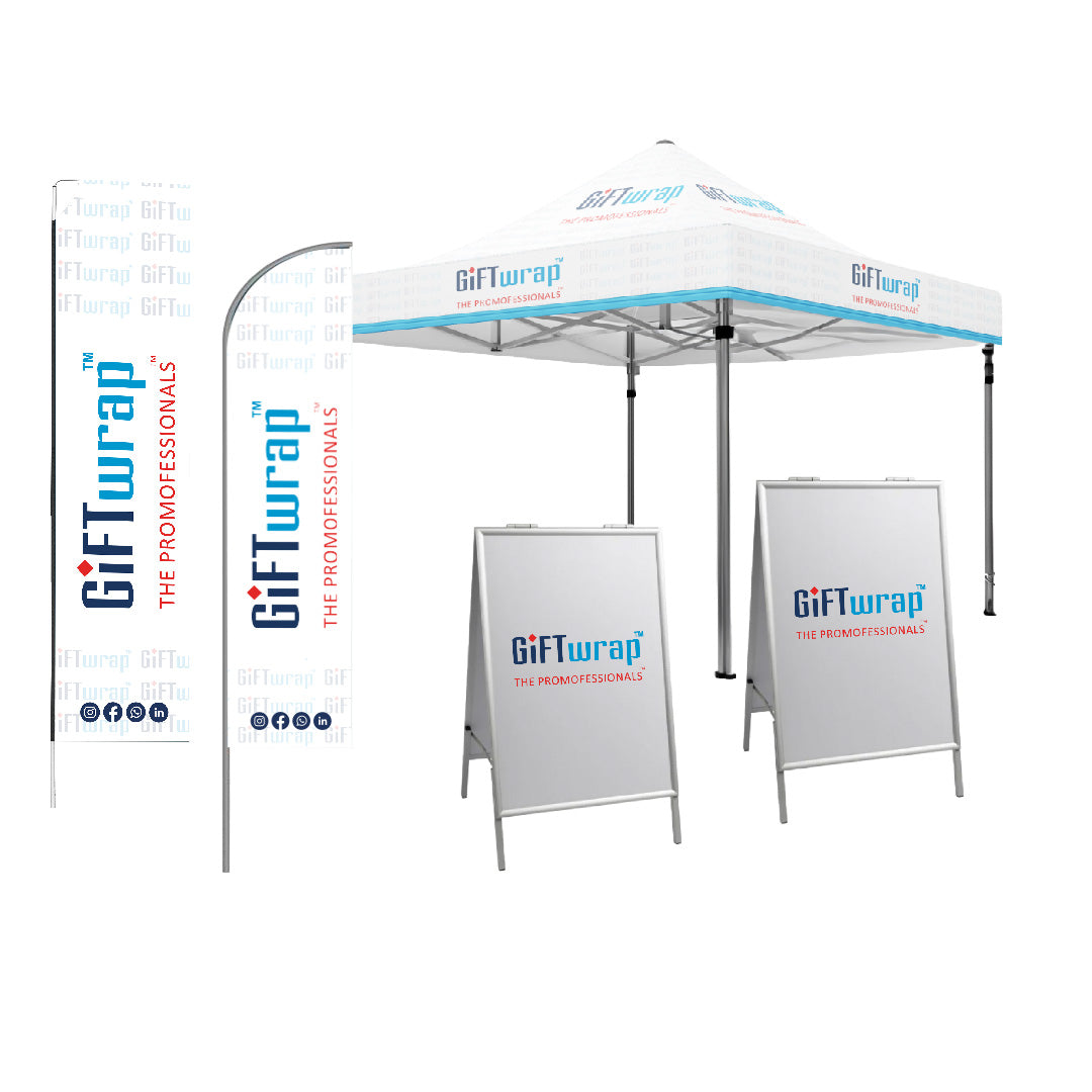 Includes: 1 x 3 m Gazebo Aluminium 1 x 2 m Single Sided Telescopic Banners 1 x 2 m Single Sided Windcheater Banners 2 x Sandwich Boards
